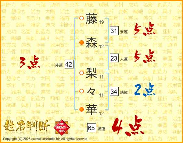 藤(19画)森(12画) 梨(11画)々(11画)華(12画)