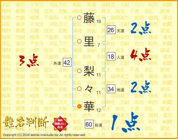 藤(19画)里(7画) 梨(11画)々(11画)華(12画)