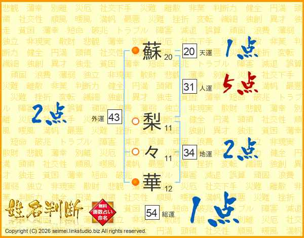 蘇(20画) 梨(11画)々(11画)華(12画)