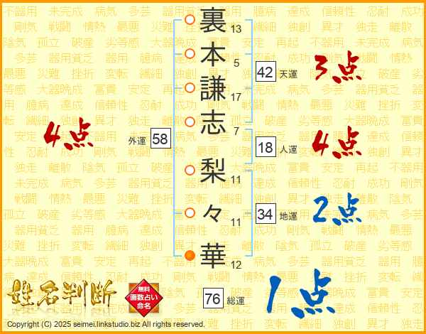 裏(13画)本(5画)謙(17画)志(7画) 梨(11画)々(11画)華(12画)