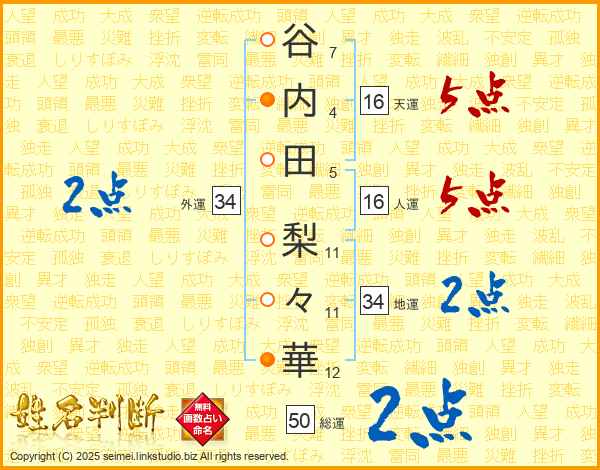 谷(7画)内(4画)田(5画) 梨(11画)々(11画)華(12画)