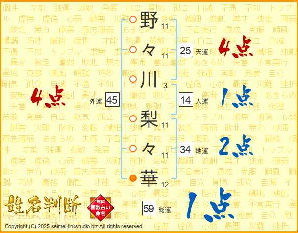 野(11画)々(11画)川(3画) 梨(11画)々(11画)華(12画)
