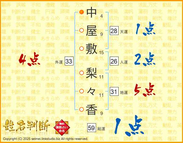 中(4画)屋(9画)敷(15画) 梨(11画)々(11画)香(9画)