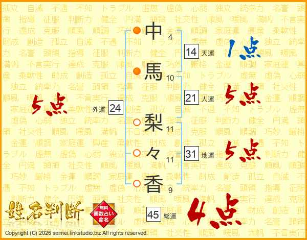 中(4画)馬(10画) 梨(11画)々(11画)香(9画)
