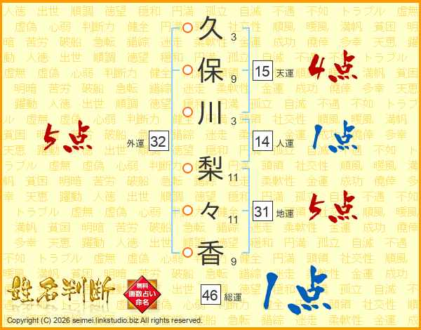 久(3画)保(9画)川(3画) 梨(11画)々(11画)香(9画)