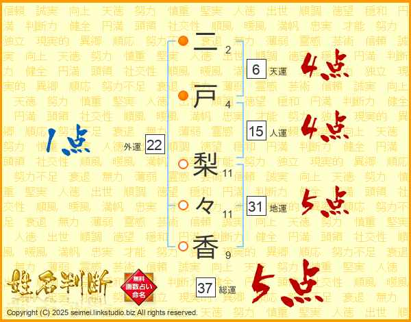 二(2画)戸(4画) 梨(11画)々(11画)香(9画)