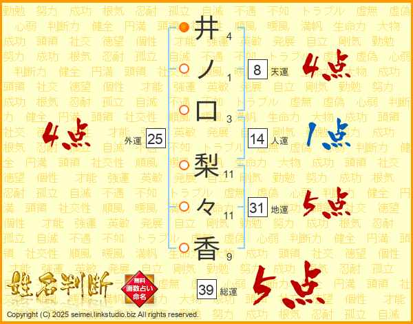井(4画)ノ(1画)口(3画) 梨(11画)々(11画)香(9画)