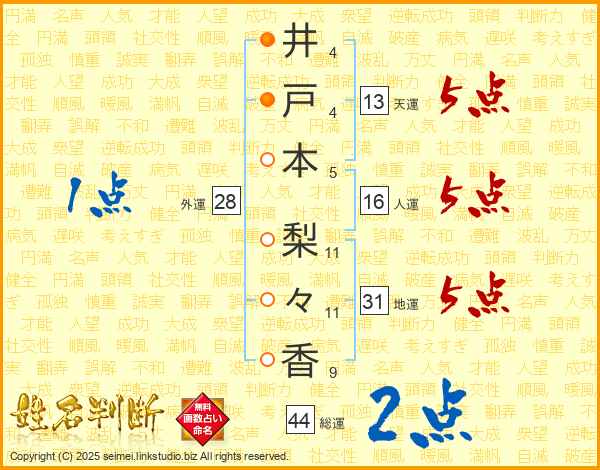 井(4画)戸(4画)本(5画) 梨(11画)々(11画)香(9画)