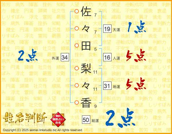 佐(7画)々(7画)田(5画) 梨(11画)々(11画)香(9画)