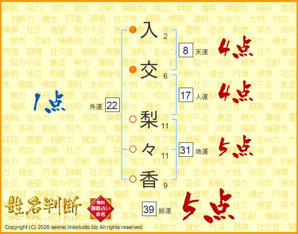 入(2画)交(6画) 梨(11画)々(11画)香(9画)