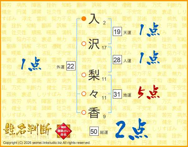 入(2画)沢(17画) 梨(11画)々(11画)香(9画)