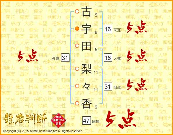古(5画)宇(6画)田(5画) 梨(11画)々(11画)香(9画)