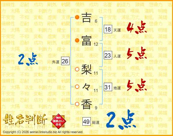 吉(6画)富(12画) 梨(11画)々(11画)香(9画)
