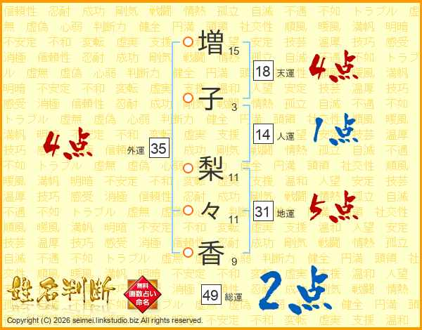 増(15画)子(3画) 梨(11画)々(11画)香(9画)