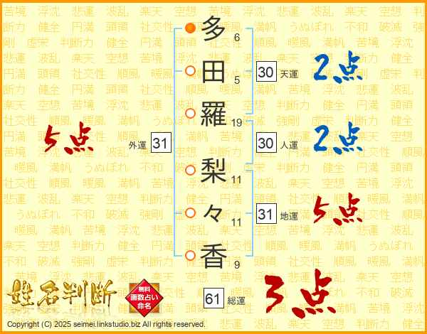 多(6画)田(5画)羅(19画) 梨(11画)々(11画)香(9画)