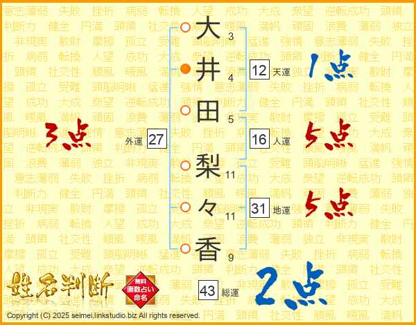 大(3画)井(4画)田(5画) 梨(11画)々(11画)香(9画)
