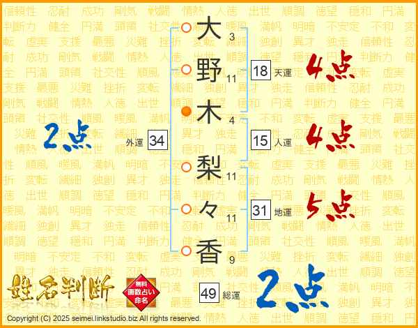 大(3画)野(11画)木(4画) 梨(11画)々(11画)香(9画)