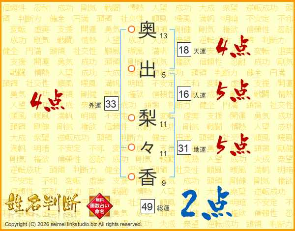 奥(13画)出(5画) 梨(11画)々(11画)香(9画)
