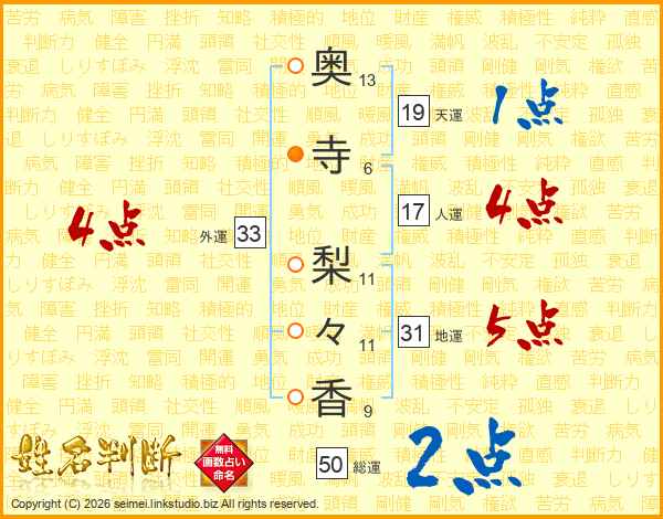 奥(13画)寺(6画) 梨(11画)々(11画)香(9画)