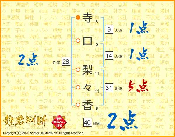 寺(6画)口(3画) 梨(11画)々(11画)香(9画)