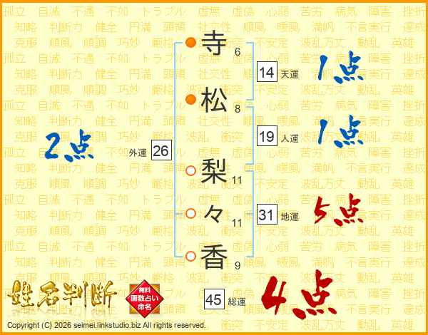 寺(6画)松(8画) 梨(11画)々(11画)香(9画)