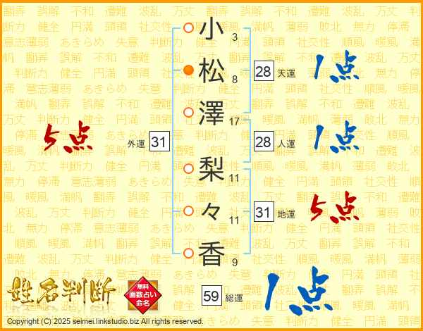 小(3画)松(8画)澤(17画) 梨(11画)々(11画)香(9画)