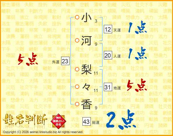 小河梨々香さんの総運は43画の2点!
