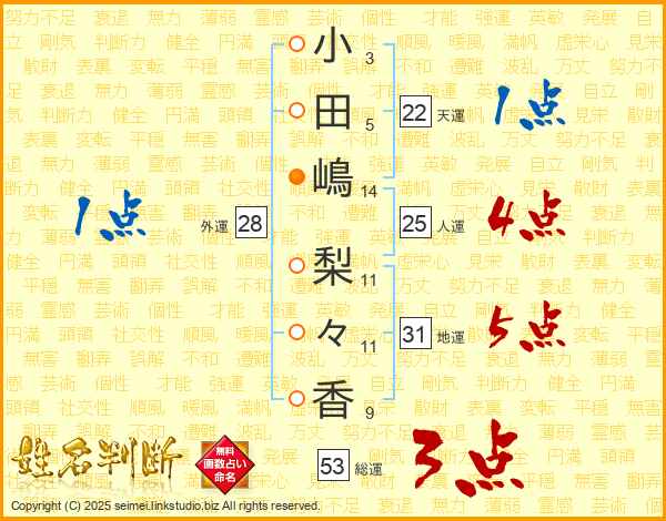 小(3画)田(5画)嶋(14画) 梨(11画)々(11画)香(9画)