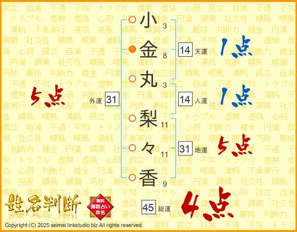 小(3画)金(8画)丸(3画) 梨(11画)々(11画)香(9画)