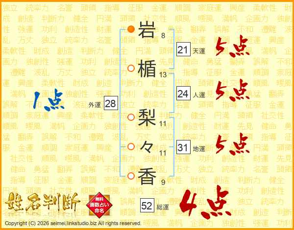 岩楯梨々香さんの総運は52画の4点!