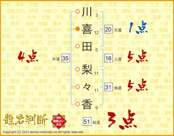 川(3画)喜(12画)田(5画) 梨(11画)々(11画)香(9画)