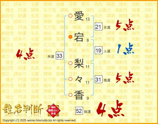 愛(13画)宕(8画) 梨(11画)々(11画)香(9画)