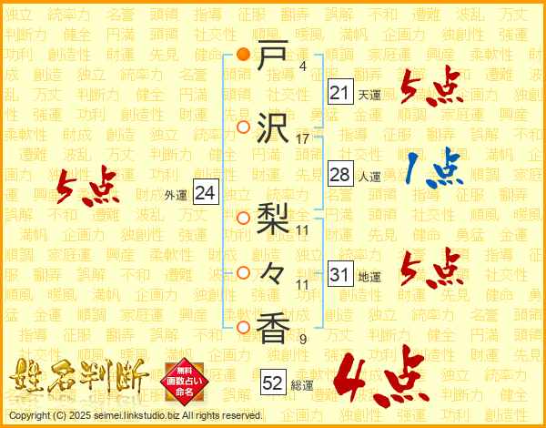 戸(4画)沢(17画) 梨(11画)々(11画)香(9画)
