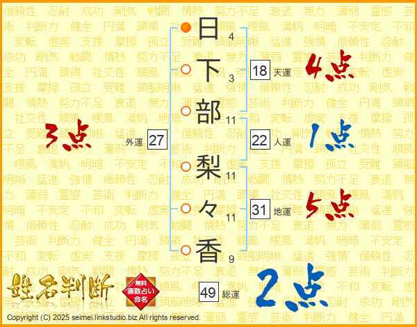 日(4画)下(3画)部(11画) 梨(11画)々(11画)香(9画)