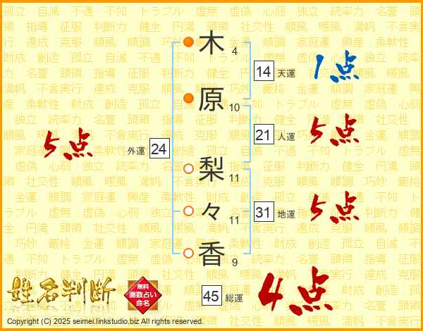 木(4画)原(10画) 梨(11画)々(11画)香(9画)