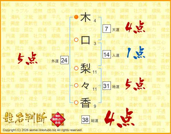 木(4画)口(3画) 梨(11画)々(11画)香(9画)