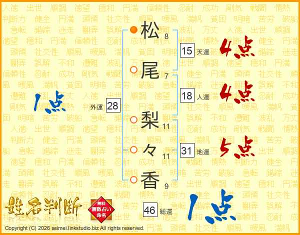 松(8画)尾(7画) 梨(11画)々(11画)香(9画)