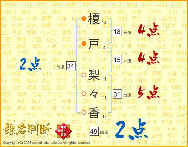 榎(14画)戸(4画) 梨(11画)々(11画)香(9画)