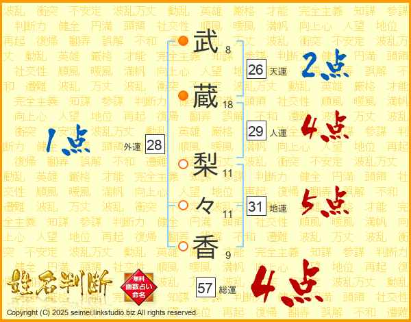 武(8画)蔵(18画) 梨(11画)々(11画)香(9画)