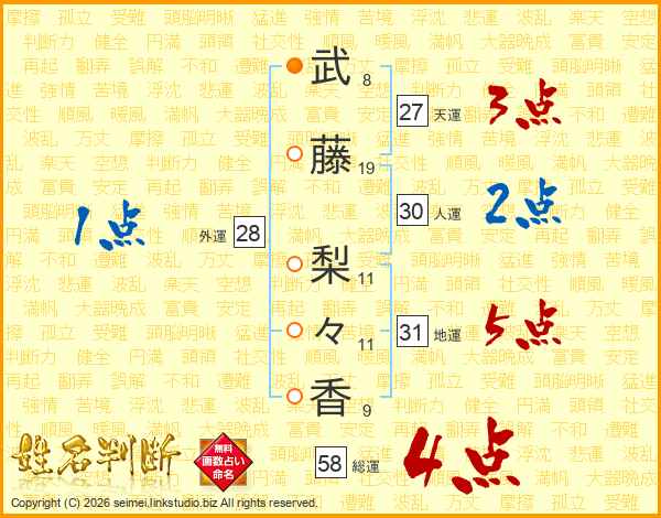 武(8画)藤(19画) 梨(11画)々(11画)香(9画)