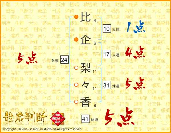 比(4画)企(6画) 梨(11画)々(11画)香(9画)
