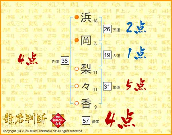 浜(18画)岡(8画) 梨(11画)々(11画)香(9画)