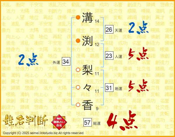 生活面を象徴する運勢です。外部から受ける影響力を表し、結婚運、家庭運や職場、環境への順応性を表します。総運から人運を引いた画数。姓や名が1文字の場合を除く。