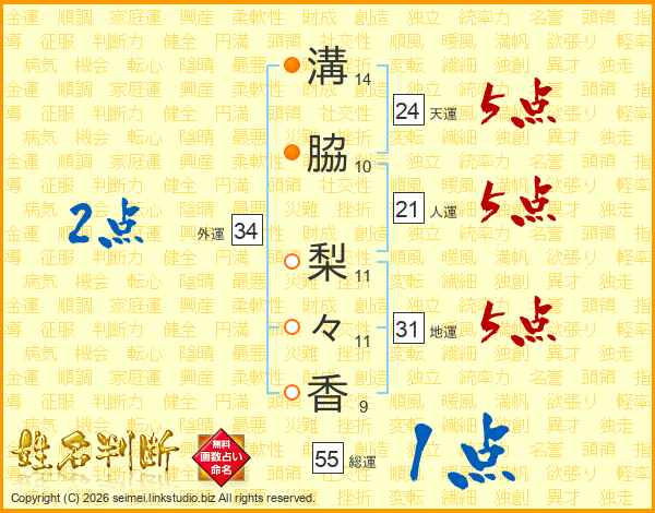 溝(14画)脇(10画) 梨(11画)々(11画)香(9画)