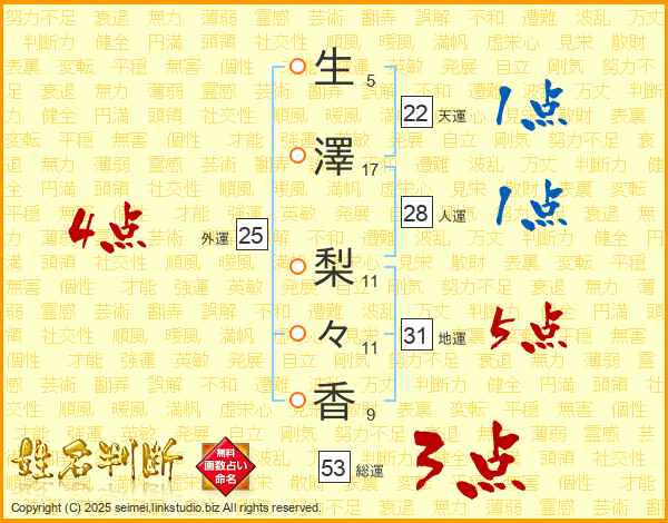 生(5画)澤(17画) 梨(11画)々(11画)香(9画)
