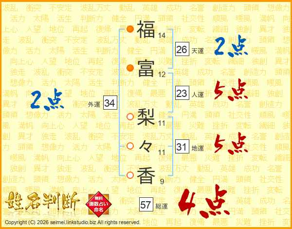 福(14画)富(12画) 梨(11画)々(11画)香(9画)