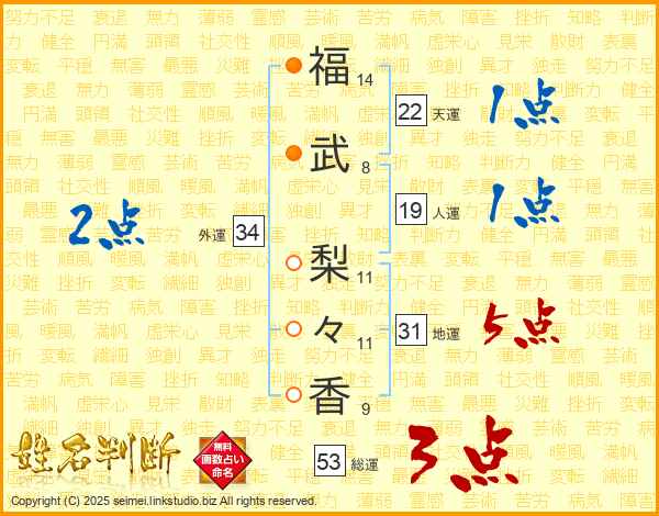 福(14画)武(8画) 梨(11画)々(11画)香(9画)