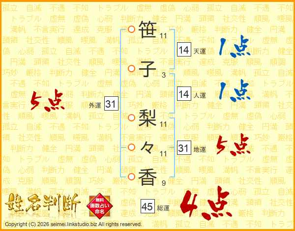 笹(11画)子(3画) 梨(11画)々(11画)香(9画)