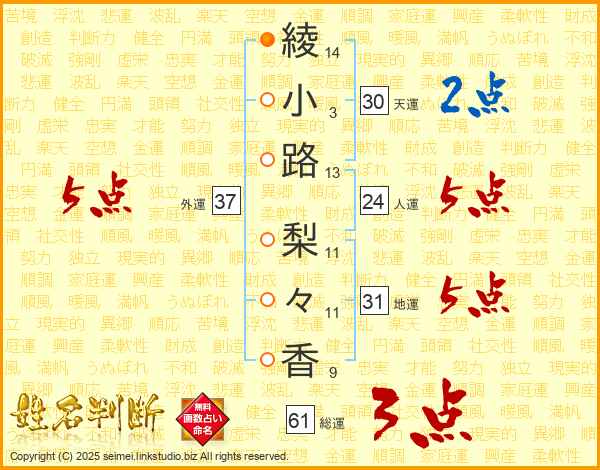 綾(14画)小(3画)路(13画) 梨(11画)々(11画)香(9画)