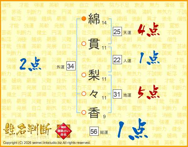 綿(14画)貫(11画) 梨(11画)々(11画)香(9画)
